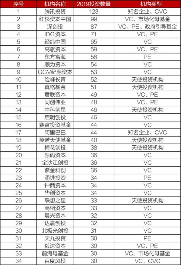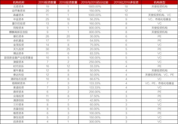 再冷的寒冬,还是有阳光的出现。2019比2018投资多的机构有80多家。但是如果是多3次投资以上的,这个数字就变成了37了。这是好事,应该手动列清单,点个赞。
