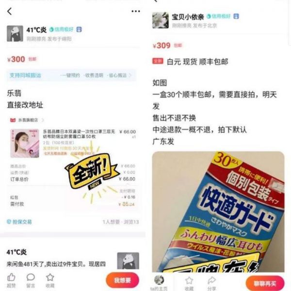 但是,这些举措并不能完全杜绝黄牛。在闲鱼直接搜索个别口罩的品牌关键词,仍然有大量高价转卖。比如下图所示,该品牌口罩正常购买的价格是99元30个,该闲鱼卖家的价格则是309元。另一个卖家甚至直接晒出自己66元购买的口罩截图,并以300的价格售出。