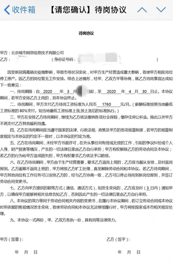 有员工晒出了待岗协议,其中的甲方信息显示为“北京城市网邻信息技术有限公司”,据公开资料显示,北京城市网邻信息技术有限公司正是58同城公司的总称。