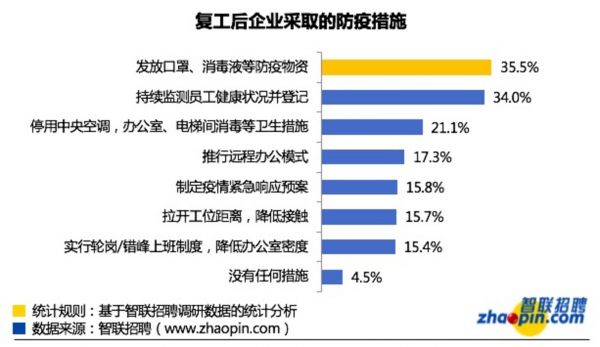 智联招聘简报指出,有序复工后,企业采取的防疫措施主要集中在发放防疫物资、日常健康检测、卫生消毒,分别占比35.5%、34%和21.1%。回答“没有任何措施”的受访者仅占4.5%。