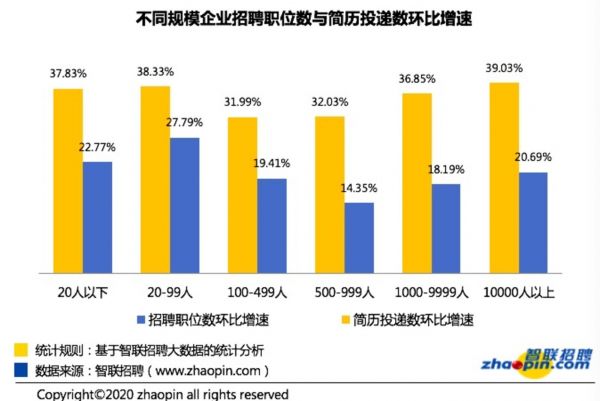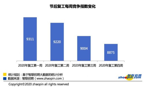 与上周相比,复工后第四周的招聘职位数环比增加21.43%,简历投递量环比增速为35.05%。该周报也指出,今年的招聘动作在疫情影响下虽有延后,但目前招聘需求还在不断向高峰攀升,预计接下来几周人才市场也有望保持反弹。