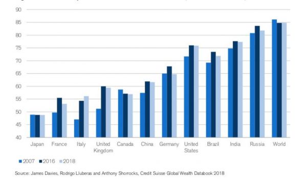 瑞信《Global Wealth Report 2018》,全球不同国家Top10%人群的财富占比请输入图说