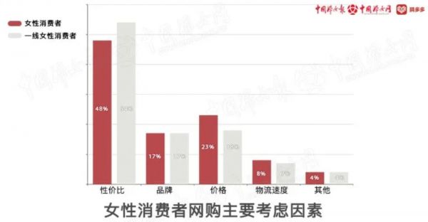 由阿里妈妈联合天猫消费电子行业发布的“女性新势力”洞察显示,女性在关注产品时有三大特点:一,外观偏重突显个人特色和生活风格;二,讲究产品的专业细分功能;三,提效、省时省力。而中国妇女报·中国妇女网发布的《新电商平台上的女性》数据报告显示,93%的女性用户曾有主动分享商品给好友以共同拼团的行为,近五成女性消费者将性价比列为购物的第一考虑因素。