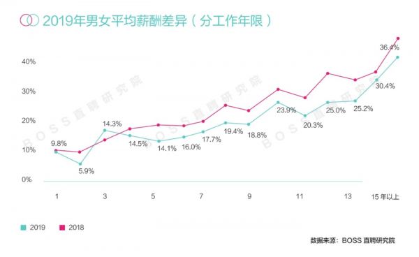 此外,男女薪酬差异会随着工作年限增加而逐渐拉大。2019年,这样的趋势依然在延续。BOSS直聘研究院数据显示,当工作经验超过15年时,男性和女性在2019年的薪酬差异已经拉大到36.4%,在3年和10年阶段呈现两个较明显的转折点。但我们可以清楚地观察到,2019年男女薪酬差异随工作经验变化的曲线明显处于2018年下方,说明薪酬差异随工作年限延长而拉大的情况尽管还是很严重,但随着女性在职场中参与度和贡献力的强化,整体状况正出现改善迹象。