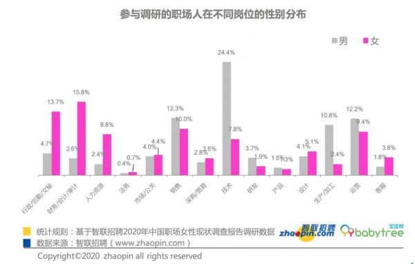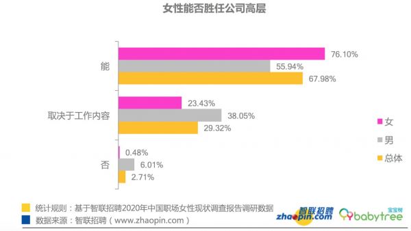 智联招聘联合宝宝树发布的《2020中国女性职场现状调查报告》显示,当前女性的整体收入依然低于男性17%,但较去年的23%进一步拉近差距;67.98%的受访者认为女性可以胜任公司高层,女性选择这一选项的占比更高,而认为女性不能胜任公司高层的男性占比更高;“职业性别”不平衡,男性多在技术岗,女性多在职能岗。