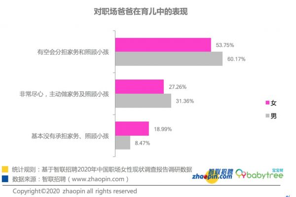 值得注意的是,今年疫情下的远程办公让40.63%的职场妈妈认为比平时更加忙碌,46.05%的职场妈妈认为工作效率提升,37.92%的职场妈妈认为远程办公更方便照顾家庭。而职场爸爸们对远程办公这一模式则更多的认为团队协作不方便、考验自律性等问题上。