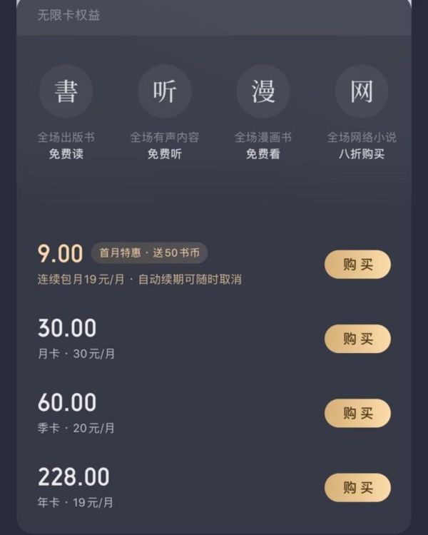 同时,对钟情于阅读本身的消费者来说,实体书的质感与实体书店的氛围固然重要,电子书的价格优势却无法被忽略。由于纸价、物流、书号费等费用的上涨,近几年实体图书的价格上涨幅度不小。有数据显示,2016年新书平均定价是65.5元,但2018年新出版的图书平均定价已经涨到68.5元。相较之下,微信读书等电子阅读平台推出的30元月卡、60元季卡、228元年卡的无限卡权益即可畅读全场出版书,二者之间的客单价差异巨大。