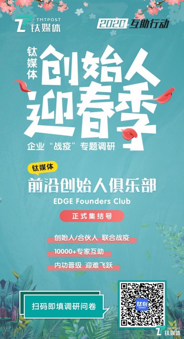 基于调研和大数据分析,我们将评估各行业和企业所受影响程度,形成分析报告,您填写的内容将进入我们公开发表的企业战疫调研报告。同时,我们还将基于钛媒体的企业咨询和产业服务能力,组建「前沿创始人俱乐部」,倡导理性认知,科学发展,助力创始人互助前行,向企业提供有力的帮助。