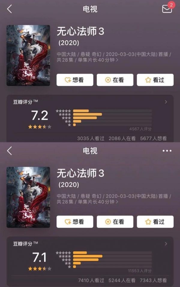 2015年,《无心法师1》凭借惊险新奇的剧情和生动灵活的人物,惊艳了不少观众,搜狐视频播放量高达16.68亿,直到现在,《无心法师1》的豆瓣评分仍保持在8.3/82468人。但沉寂两年后,再登场的《无心法师2》却折了戟,话题热度远不及前作,观众口碑也是高开低走,收官后只拿到了6.1/26303人的豆瓣评分。