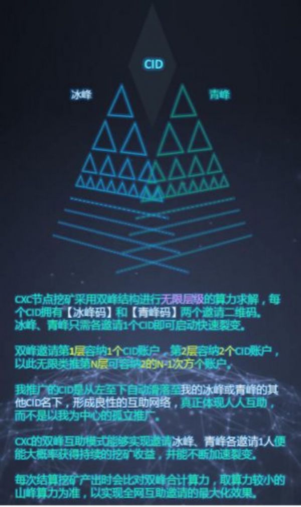 在传销模式上,CXC几乎做到了极致。“在所有的币圈资金盘里,CXC的设计算是最复杂的。”CXC玩家李雷说,“特别是它的‘双峰挖矿’模式,十分精妙。”
