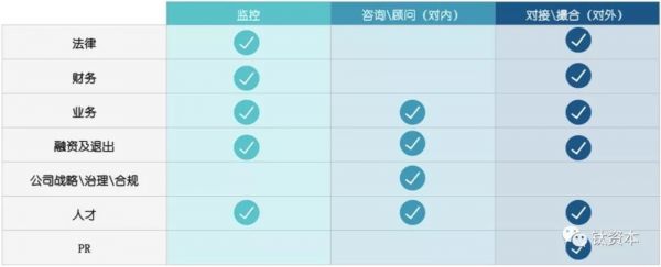 第三类是对接跟撮合类:基本是法务、财务、业务、融资退出、公司战略治理合规、人才、PR等几部分。法律方面,为日常运营、拆VIE、股权激励、上市等重要时点方面,推荐有能力的律师或律所;