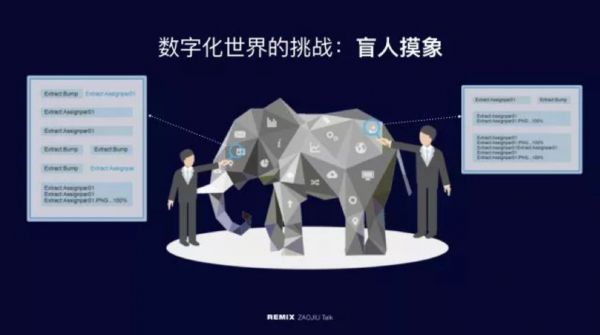 什么意思?大象就像是这个世界的真相,在全数字化世界里面,这个大象就是数据的全面集合。我们每个人都是盲人,有的人摸到了数据的鼻子,有的人摸到数据的腿,有的人摸到了数据的背。