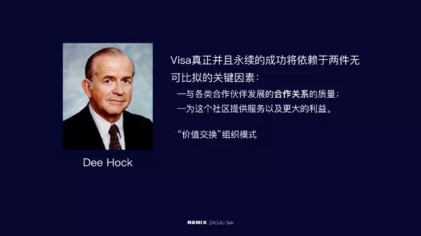 第二个人叫Dee Hock 。他是VISA的创始人,也是第一任总裁。当时情况非常混乱,大概有几十、上百家发行信用卡的银行或者金融机构在互相吵架,无法达成一致。