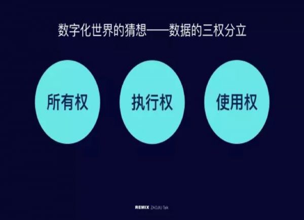 基于这样的命题,我们提出了一个猜想,借用了一个概念,把它叫做:数据的三权分立。包括数据所有权,以及相对应的使用权,另外,又引入一个新概念叫执行权。