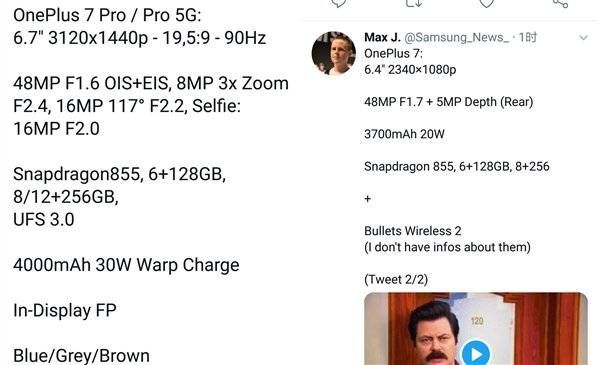 作为超旗舰定位的一加7 Pro(一加7 Pro 5G),预计将搭载一块6.7寸 3120x1440P显示屏(19.5:9),刷新率90Hz,后置三摄为4800万(F/1.6、OIS)主镜、800万(3倍光变)长焦和1600万广角(117度),前置为一颗1600万像素自拍镜头。核心硬件还有骁龙855处理器,6+128GB起步,最高12+256GB,UFS 3.0,4000mAh电池(30W快充)、屏幕指纹技术、有蓝色、灰色和褐色。