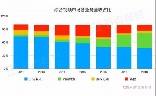 尽管目前来看腾讯视频、爱奇艺、优酷占去了大部分市场,但是盈利仍然是遥遥无期。尽管近几年以来,在线视频网站的收入配比上看,广告收入的占比正在逐渐收缩,也说明了行业正在逐步探索除了广告这种流量变现的方式之外,更多可持续的可能性。