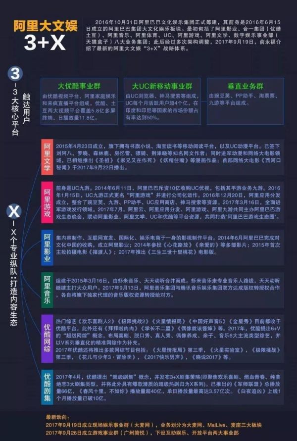 对于阿里的生态来说,变现方式是以电商为核心的。以优酷和UC两大流量入口为核心,通过文学、游戏、音乐、网综、剧集等来积累流量,并最终通过电商模式实现变现的转化。
