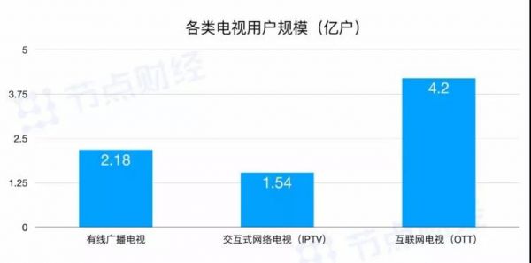 据统计,中国2018年有线广播电视的用户量为2.18亿户,交互式网络电视用户量为1.54亿,互联网电视用户量为4.2亿户,超过前两者的总和。