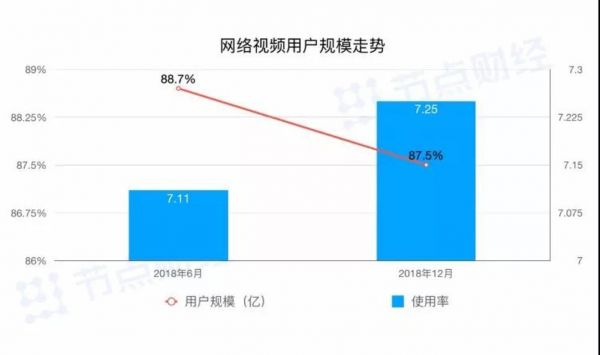 2018年12月,中国网络视频用户达到7.25亿,使用率较上半年有所下降,为87.5%。