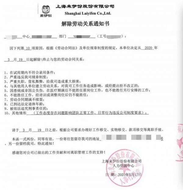 据了解,来伊份品牌系统的HRBP对前述“被裁”员工表示,“N+1的赔偿、年终奖、缴纳3月份公积金都可以有,但是离职证明上还是要写‘不胜任’。”该员工表示,“2019年,部门领导对我的岗位胜任评价是‘完全胜任,来伊份HRBP部经理对我的评价是‘有很好的内外部沟通能力;价值观评估为A/A+;年度评分93.4分,这样的评价在离职证明上写‘不胜任’是没有事实依据的。”