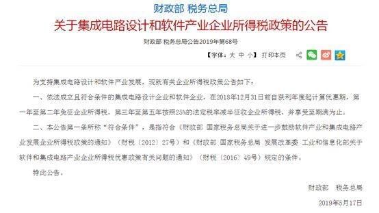 除此之外,中国政府也为华为送上了大礼物。2019年5月17日财政局和国家税务总局联合发文,对集成电路设计和软件产业企业前两年免征企业所得税,这是个及时雨。