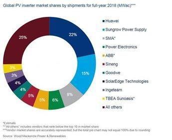 例如光伏逆变器,下图是2018年的全球出货量排名,第一名就是华为,占全球22%。前十名都是来自中国和欧洲,美国企业都不在前10位。