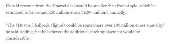 华为需要支付给诺基亚每年大约1亿欧元,而苹果每年需要支付给诺基亚的技术授权费用为2.5亿欧元。如果再加上三星、LG、小米、OV等其他全球手机公司,以及爱立信、中兴这样的通信设备公司,每年诺基亚都可以获得稳定可观的专利授权收入。这对诺基亚来说,可是纯利润。