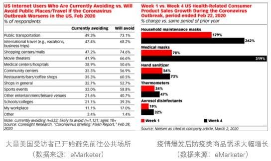 调查显示,74.6%的美国受访者表示,若疫情继续恶化,他们将避免前往大型购物场所,转而通过网络购物。另一项调查还显示,目前美国消费者防疫类产品需求大幅上升。