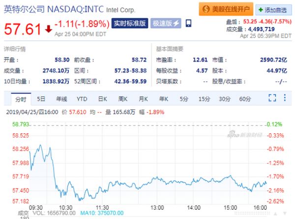 当日,英特尔股价在纳斯达克常规交易中下跌1.11美元,报收于57.61美元,跌幅为1.89%。在随后截至美国东部时间周二下午5点39分(北京时间周三凌晨5点39分)的盘后交易中,英特尔股价再次下跌4.36美元,至53.25美元,跌幅为7.57%。