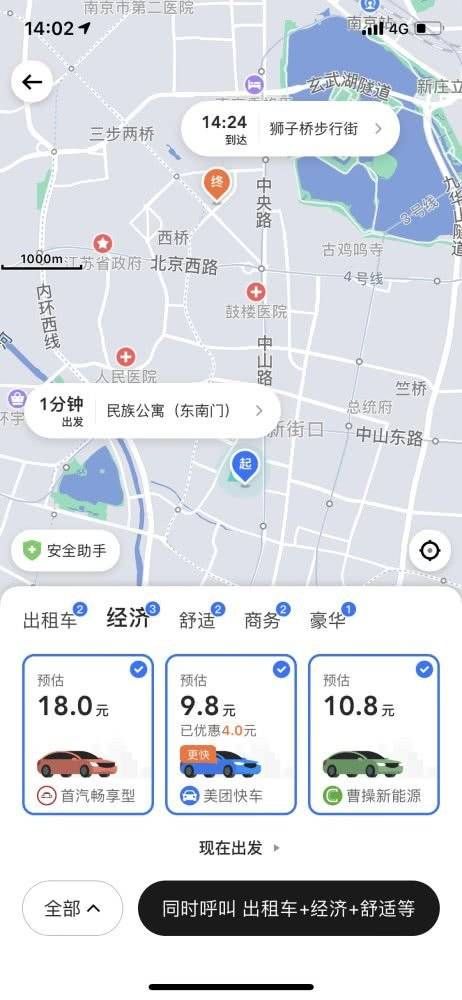 目前,上海、南京用户通过美团App进入打车服务入口,输入出行起始地址后,在页面下方可以看到由首汽约车、曹操出行、神州专车等出行服务商提供的出租车、经济、舒适、商务、豪华共五种打车服务。