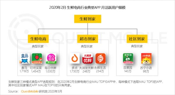 具体来看,2020年2月,生鲜电商领域Top3的盒马、叮咚买菜、每日优鲜,MAU分别达到了1719万、1454万、1030万;超市到家领域Top3的多点、大润发优鲜、永辉生活,MAU分别达到1730万、248万、234万;社区到家领域Top2玩家百果园、苏宁小店,MAU分别达到143万、98万。