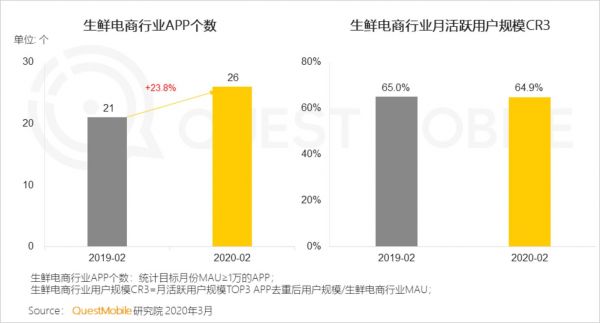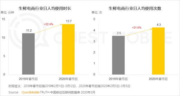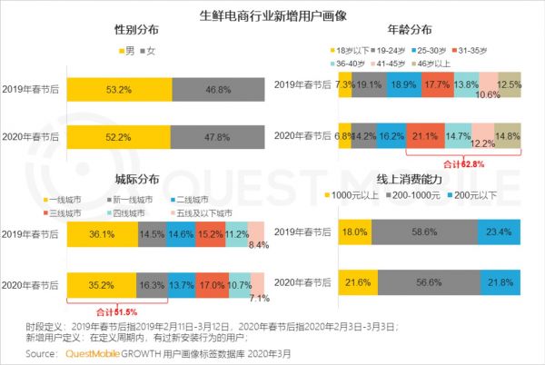 QuestMobile数据显示,生鲜到家在春节后的一个月MAU接近7000万,去年同期为4400万,同时,日人均使用次数、时长增幅均在20%以上。从用户画像上看,新增用户以一二线城市、31岁以上、线上消费能力较高的用户为主。