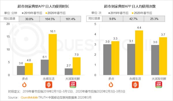 3.3 超市到家典型APP用户粘性显著增强,日人均使用时长、日人均使用次数均有不同程度的增加