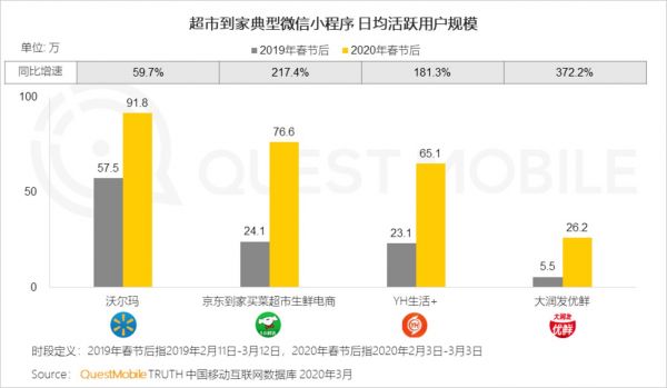 与此同时,微信小程序也成了关键入口,沃尔玛小程序日均活跃用户规模近百万,京东到家买菜超市生鲜电商增至76.6万,永辉的YH生活+也增至65.1万,大润发优鲜微信小程序日活从5万增至26万,增长近4倍。