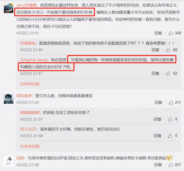 瑞幸本体则是“薅资本主义羊毛”,用美国“老实人”的钱请中国人民喝咖啡的“民族英雄”。