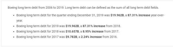 波音的钱,根本不够他用来分红和回购的,于是他们每年只能通过发行优先股向股民借钱,或者向银行贷款。乃至于最近这些年,波音的负债大幅增长,来到了200亿美金长期债务,300亿美金总债务的地步: