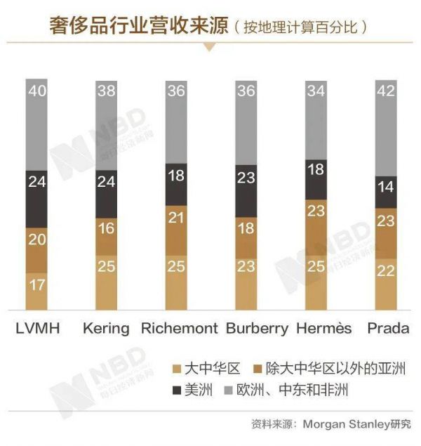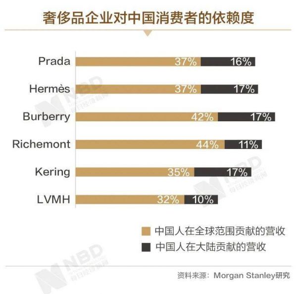 此外,Burberry、爱马仕、Prada大中华区营收均超过20%,其中国销售业绩在全年收入中的占比都已超过15%。