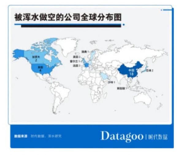 既然被称为中概股杀手,那瑞幸显然不是第一家遭浑水做空的中国公司。2010年成立的浑水公司,做空的上市公司涉及全球各国,其中有18家都是中国企业。