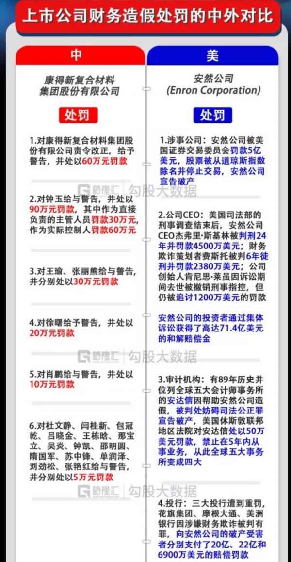 先来看看大洋彼岸我们对标的国度。作为最典型的注册制国家,美国用80多年的时间,已经探索出一套完备的制度体系。其中,在惩处追责方面,美国注重严刑峻法、集体诉讼和公平基金,让财务造假公司付出惨痛代价: