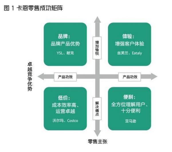 沃顿商学院的营销学教授芭芭拉·卡恩提出过“卡恩零售成功矩阵(Kahn Retailing Success Matrix)”(图1)来评估零商业是否具备成功的基础要素。横轴代表消费者想要从他们信任的人(用户体验)那里买所需的东西(产品功效);纵轴代表的是要赢得消费者,零售商需要提供比竞争对手更好的产品与服务。在她看来,要想在今天的市场存活下来,零售商必须在每个象限都至少达到及格线;要成为市场领先者,则必须在每个象限达到优秀,并至少在一个象限做到最好,而巴诺的困境在于它在每个象限中的表现都不够优秀。