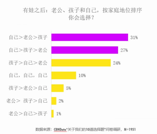 CBNData问卷调研数据显示,近60%的婚后女性在“自己、老公、孩子”的地位排序中,选择将自我放在第一位。
