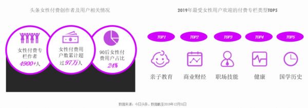 同时,越来越多的女性读者开始愿意为优质内容买单。以今日头条为例,截至2019年底,全年平台女性付费专栏作者近5000人,女性付费用户有近百万,其中90后占24%。在所有的付费专栏里,亲子教育、商业财经和职场技能类专栏最受女性用户喜欢。