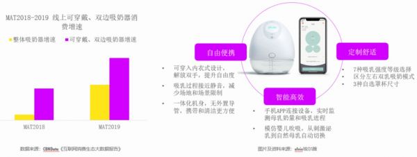 在智能吸奶器的线上消费中,可穿戴式双边吸奶器增长显著。以英国品牌elvie埃尔薇为例,可穿入内衣的一体化机身、静音高效的泵吸技术、实时监控的个性化智能模式,能够有效解决“背奶”问题,成为新手妈妈的育儿好帮手。