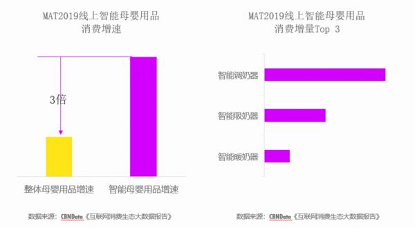 CBNData《报告》显示,线上智能母婴用品以高于整体品类平均3倍的增速发展,其中智能调奶器、智能吸奶器、智能暖奶器最受欢迎。