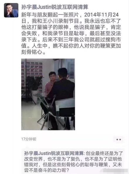 2019年2月3日,孙宇晨曾发朋友圈称,2014年11月与搜狗CEO王小川一起录制节目时,被对方称作骗子,断言自己肯定会失败。“我永远也忘不了他这打量骗子的眼神。”“他说和我录节目是耻辱。”