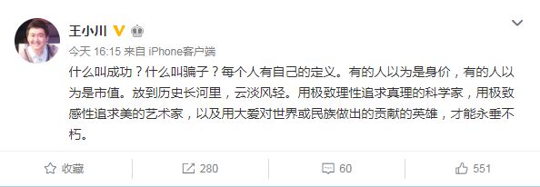 而就在孙宇晨和巴菲特吃饭的消息传播开来之后,王小川今天发微博疑似回应:什么叫成功?什么叫骗子?有的人以为是身价,有的人以为是市值。放到历史长河里,云淡风轻。