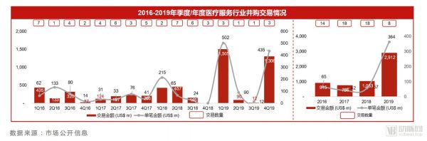 2019年国内医疗服务行业并购交易总金额约为29亿美元,相较2018年增长了约182%,主要来源于新风天域收购和睦家的交易。
