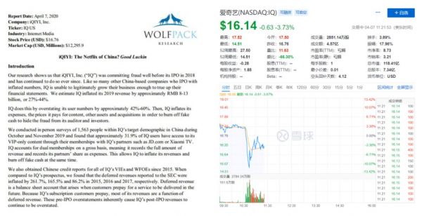 【钛媒体综合】4月7日消息,据国外媒体报道,“卖空”研究公司Wolfpack Research今日在其网站上发布爱奇艺做空报告。