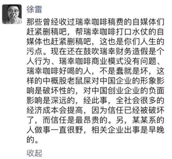 新东方创始人俞敏洪也表示,瑞幸咖啡本是为国人服务的一件好事,老百姓和投资人都有耐心去等待。但造假导致公司濒临倒闭,而且对中国企业和企业家在世界人民心中的形象,带来了很多负面影响。