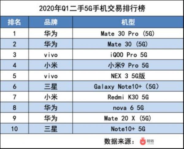 最新发布的Q1“转转手机行情”显示,与上一季度相比,二手小米5G手机跌出交易榜前三,而主打高端市场的华为反超vivo抢占了前两名的位置。数据显示,Mate 30 Pro 5G、Mate 30 5G以及iQOO Pro 5G分别占据转转平台二手5G手机交易榜的前三位。